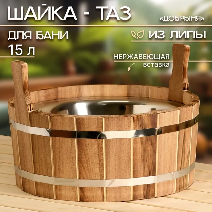 Шайка - таз для бани и сауны «Добрыня», 15 л, деревянная, нержавеющая вставка — Характеристики