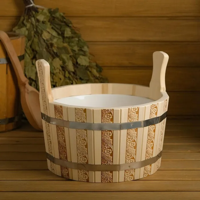 Шайка-таз из липы, 9 л, пластиковая вставка, "Русские узоры" — Характеристики