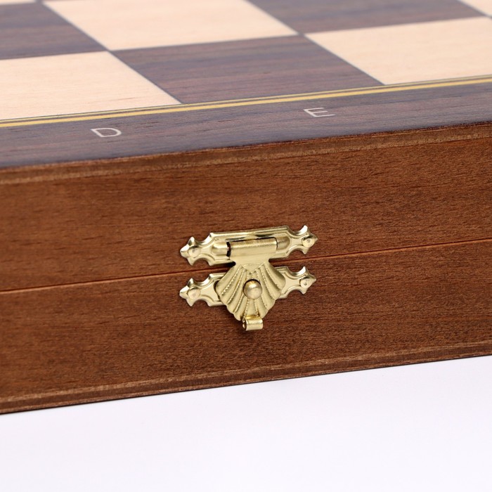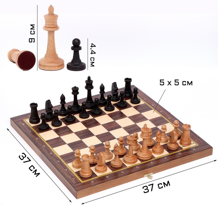 Шахматная деревянная лакированная доска выполнена из бука. Размер доски в разложенном виде 37 х 37 см. Доска имеет аккуратную и надежную фурнитуру и вместительный отсек для хранения. Фигуры оснащены утяжелителем, за счёт чего игровой процесс будет протекать комфортно, их приятно и удобно держать в руке. Они выполнены из дерева, имеют привлекательный внешний вид и длительный срок службы.