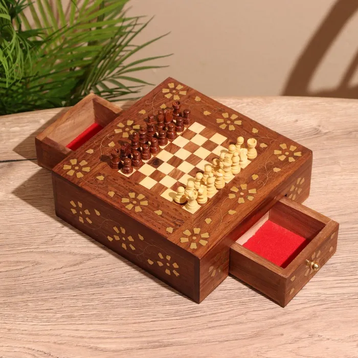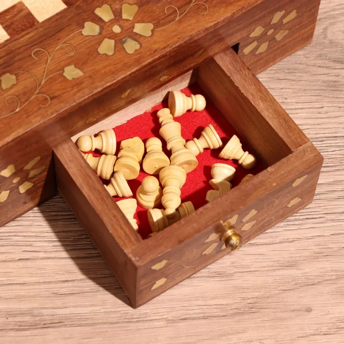 Шахматы дорожные 20,5х20,5х7 см – замечательный подарок для любителя этой сложной тактической игры. Они выполнены из дерева и украшены изящным и затейливым цветочным узором. Специальный выдвижной ящичек – удобное место для хранения фигур. Вы можете заказать эти шахматы в нашем интернет-магазине буквально несколькими кликами мышки.