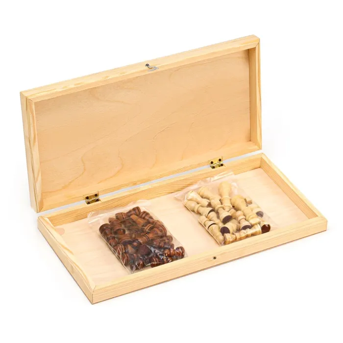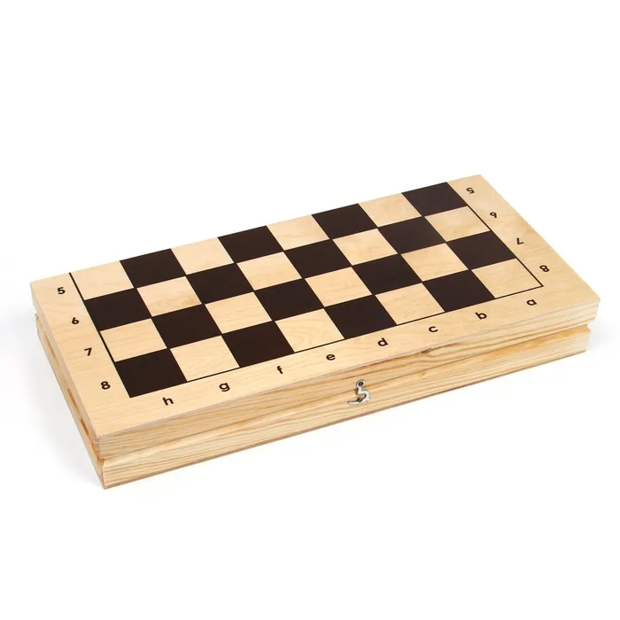 Шахматная деревянная лакированная доска из качественных пиломатериалов: каркас выполнен из сосны, поле - берёзовая фанера. Размер доски в разложенном виде 43 х 43 см. Доска имеет аккуратную и надежную фурнитуру и вместительный отсек для хранения.