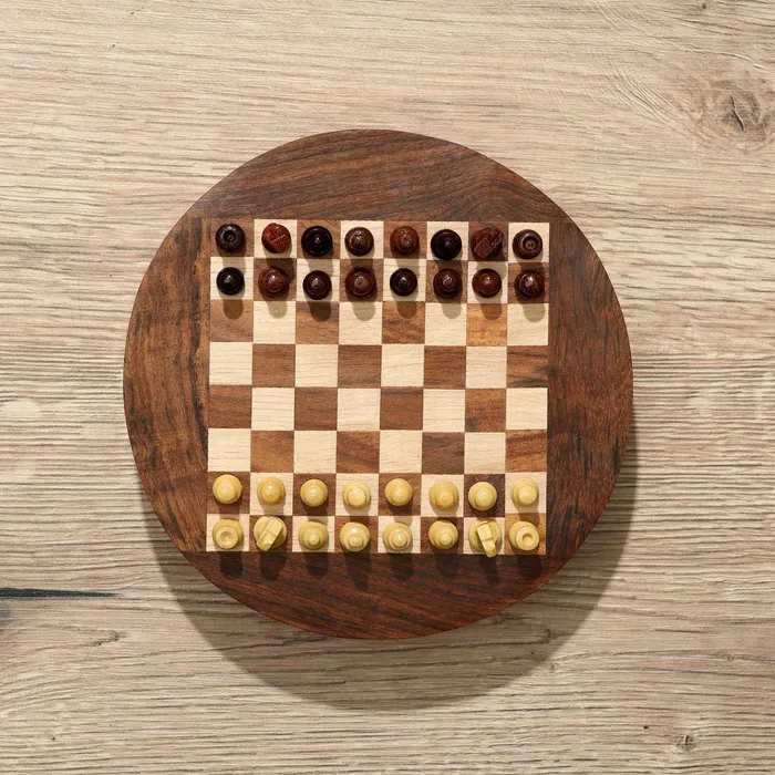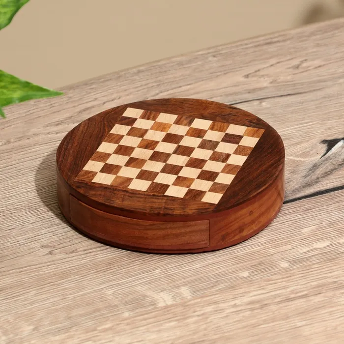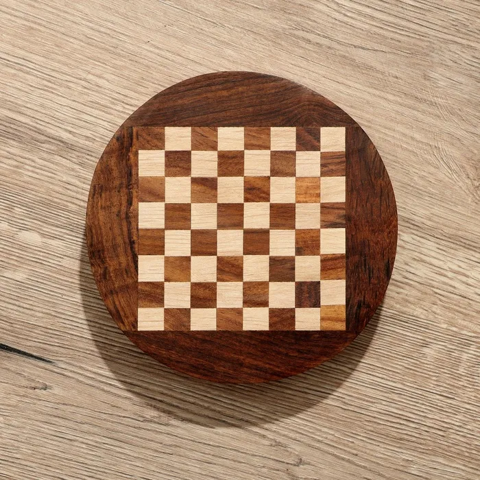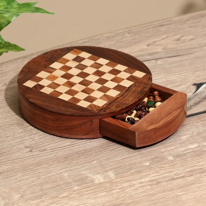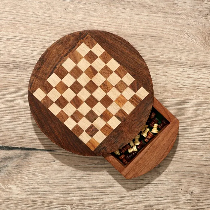 Шахматы круглые, доска 15х15 см, дерево шишам – замечательный подарок для любителя этой сложной тактической игры. Специальный выдвижной ящичек – удобное место для хранения фигур.