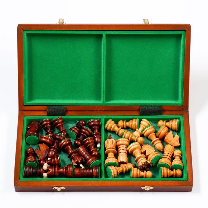 Наличие бархата зеленого цвета добавляет изыска изделию, а для удобного хранения шахматных фигур предусмотрены специальные отсеки, что обусловливает минимум передвижения при переноске.