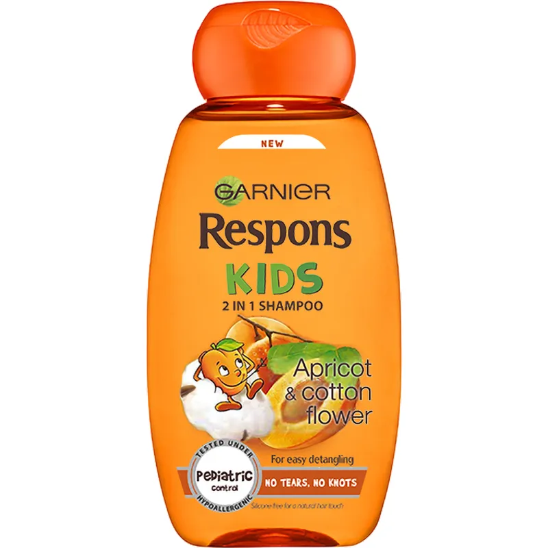 Шампунь Garnier Respons Apricot & Cotton Flower, разработанный специально для детей, мягко очищает волосы и делает их легко расчесываемыми. Его гипоаллергенная формула с восхитительным ароматом абрикоса и экстрактом цветка хлопка, известного своими успокаивающими свойствами для кожи головы, оставляет волосы мягкими и сияющими. Волосы приобретают приятный аромат абрикоса. Объем упаковки составляет 250 мл.