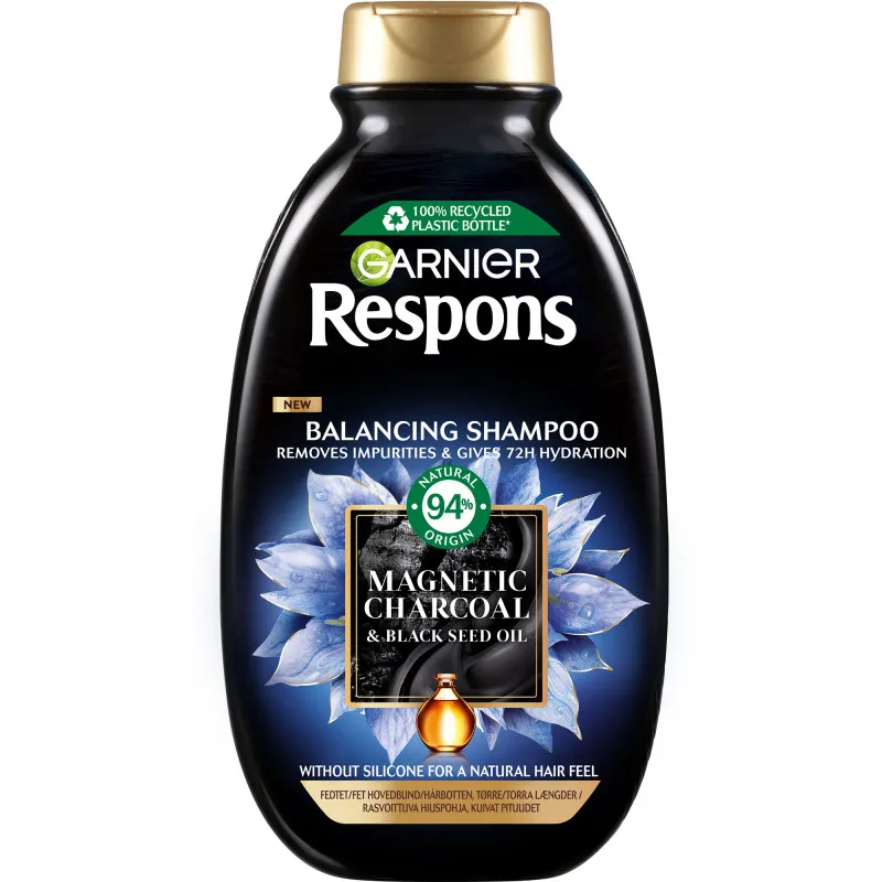 Шампунь Garnier Respons Magnetic Charcoal разработан для балансировки волос, склонных к сухости и жирной коже головы. В составе шампуня очищающий уголь и масло семян черного тмина. Содержит 94% ингредиентов натурального происхождения. Веганская формула. Garnier официально одобрена программой Cruelty Free International Leaping Bunny.