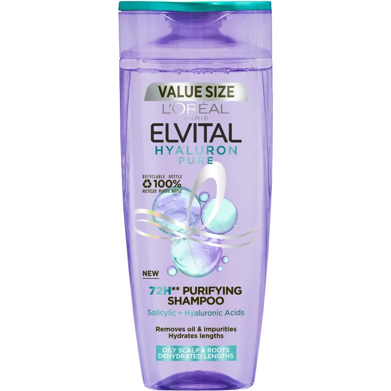 Шампунь L'Oréal Paris Elvital Hyaluron Pure идеально подходит для волос, нуждающихся в увлажнении. Он мягко очищает волосы от загрязнений и пота, не нарушая естественного баланса кожи головы, и оставляет ощущение свежести до 72 часов. В состав шампуня входят салициловая и гиалуроновая кислоты.