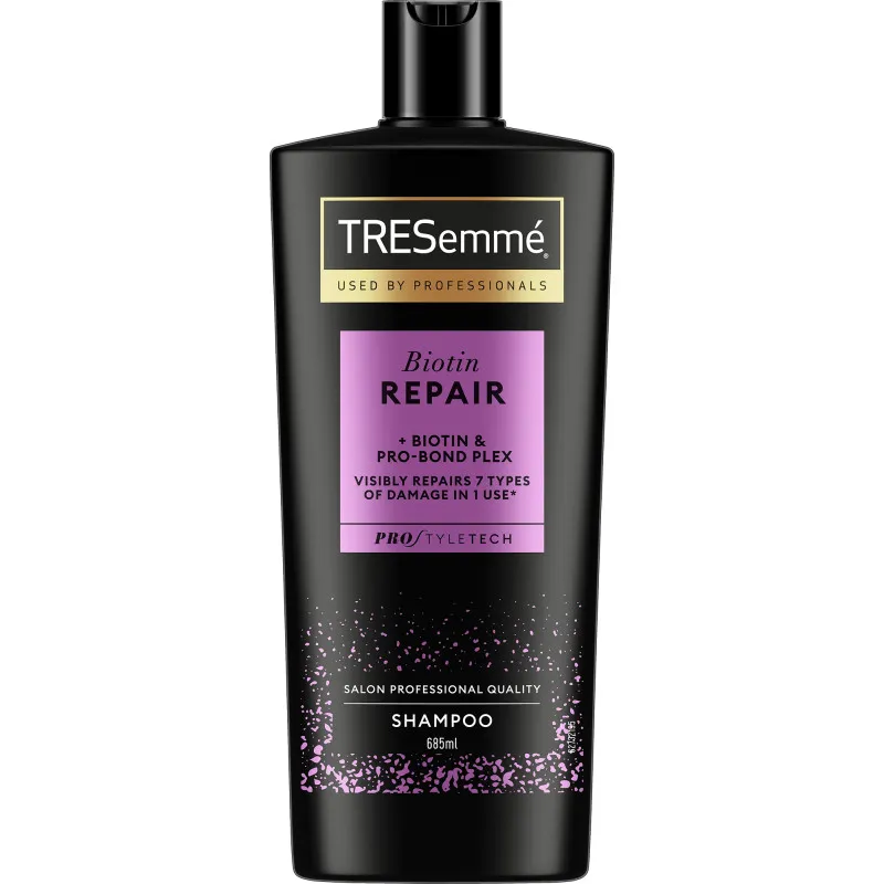 Шампунь TRESemmé Biotin Repair помогает восстановить и укрепить волосы изнутри. Он содержит биотин и Pro-Bond комплекс, который проникает в структуру волоса. Формула укрепляет белковую структуру волос и защищает их, помогая восстановить повреждения от укладки.