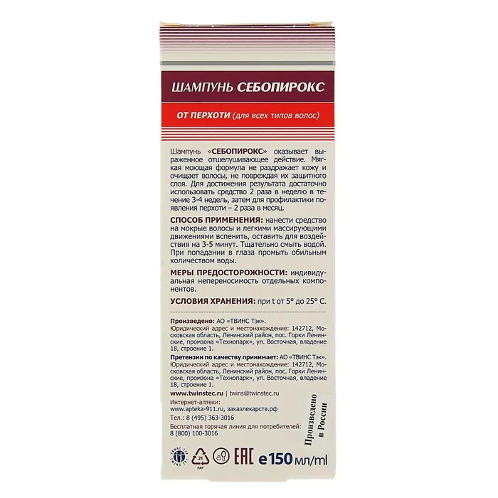 Шампунь от перхоти «Себопирокс» оказывает выраженное себостатическое, отшелушивающее действие, подавляет жизнедеятельность грибков, являющихся причиной образования перхоти. Мягкая моющая формула не раздражает кожу и очищает волосы, не повреждая их защитного слоя. Для достижения результата достаточно использовать средство 2 раза в неделю в течение 3-4 недель, затем для профилактики появления перхоти 2 раза в месяц.