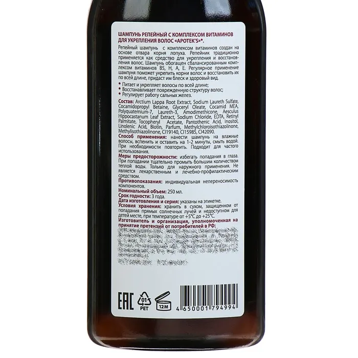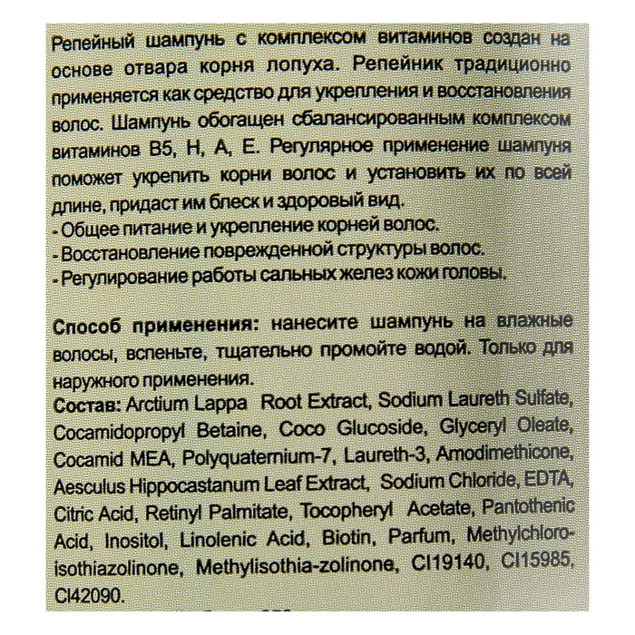 Состав: Arctium Lappa Root Extract, Sodium Laureth Sulfate, Cocamidopropyl Betaine, Coco Glucoside, Glyceryl Oleate, Cocamid MEA, Polyquaternium-7, Laureth-3, Amodimethicone, Aesculus Hippocastanum Leaf Extract, Sodium Chloride, EDTA, Citric Acid, Retinyl Palmitate, Tocopheryl Acetate, Pantothenic Acid, Inositol, Linolenic Acid, Biotin, Parfum, Methylchloroisothiazolinone, Methylisothiazolinone, CI 19140, CI15985, CI42090.