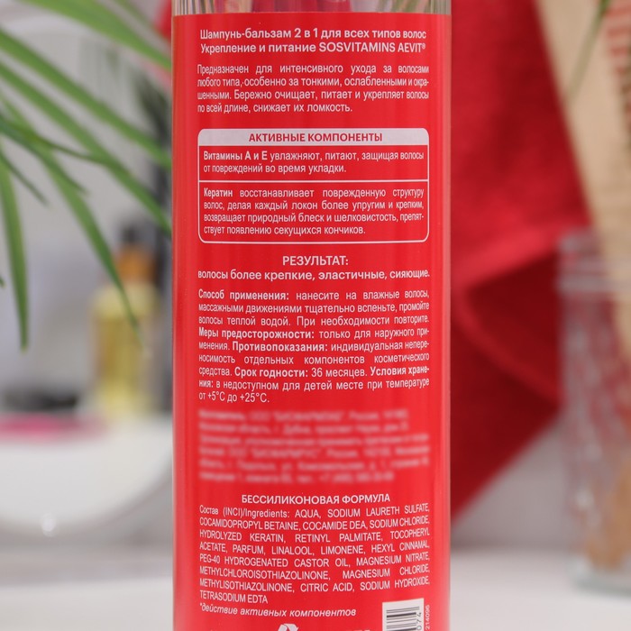 AEVIT BY LIBREDERM SOSVITAMINS Шампунь-бальзам 2в1 для волос Укрепление и питание предназначен для интенсивного ухода за волосами любого типа, особенно за тонкими, ослабленными и окрашенными. Бережно очищает, питает и укрепляет волосы по всей длине, снижает их ломкость.