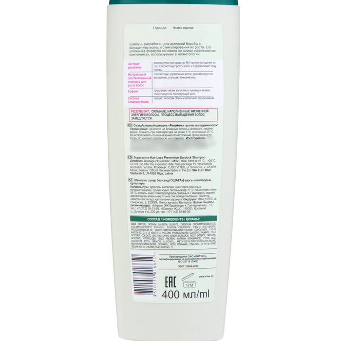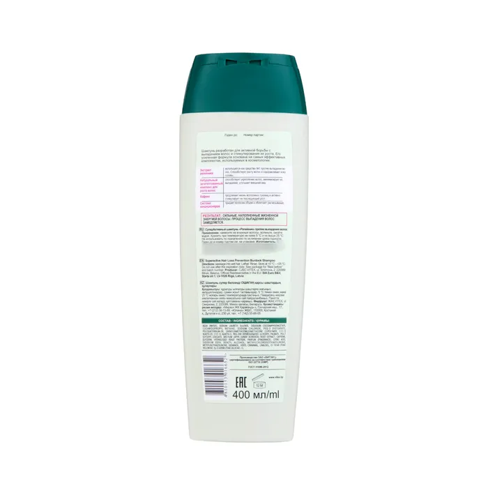 Состав: Вода, лауретсульфат натрия, кокоамфодиацетат динатрия, кокамидопропилбетаин, хлорид натрия, ПЭГ-3 дистеарат, поликватерниум-39, дивинилдиметикон / диметикон сополимер, C12-13 парет-23, C12-13 парет-3, ПЭГ-200 гидрогенизированный глицерилпальмат, ПЭГ-7 глицерилкокоат, парфюмерная композиция, экстракт корня Arctium Lappa (лопуха), лимонная кислота, кофеин, ЭДТА динатрия, бензиловый спирт, метилхлоризотиазолинон, метилизотиазолинон, глицерин, гидролизованный протеин дрожжей, CI 19140, CI 42090, цитронеллол, гексилциннамаль, линалол, бутилфенилметилпропиональ