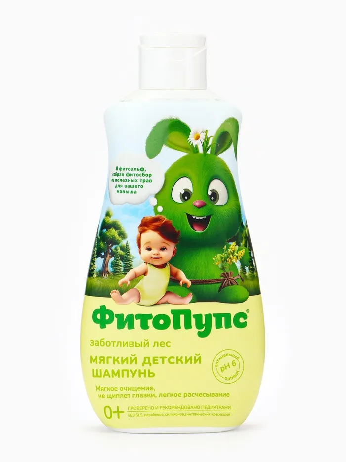 Мягкий детский шампунь Фитопупс с волшебным ароматом цветов и трав мягко очищает волосики, кожу головы младенцев и совсем не щиплет глазки. Мягкая формула средства содержит всю пользу натуральных экстрактов лесных трав, которые дарят малышу нежный уход с самого рождения.