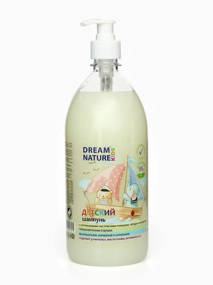 Детский шампунь для волос DREAM NATURE с ромашкой, чередой и календулой — это нежный, мягкий и особенный шампунь для детей. Гипоаллергенная формула на 95 % состоит из ингредиентов натурального происхождения и не щиплет глазки, не содержит красители, парабены и силиконы. Поэтому шампунь можно использовать для ухода за малышами. Витаминный комплекс в составе делает тонкие детские волосы шелковистыми, блестящими и здоровыми после каждого мытья. Д-пантенол и растительные экстракты ромашки, череды и календулы сохраняют уровень влажности кожи головы, смягчают ее, успокаивают раздражения и покраснения. Масло оливы предотвращает спутывание волос и облегчает расчесывание. Детский шампунь DREAM NATURE - для нежной заботы о самом дорогом человеке, которого Вы знаете.