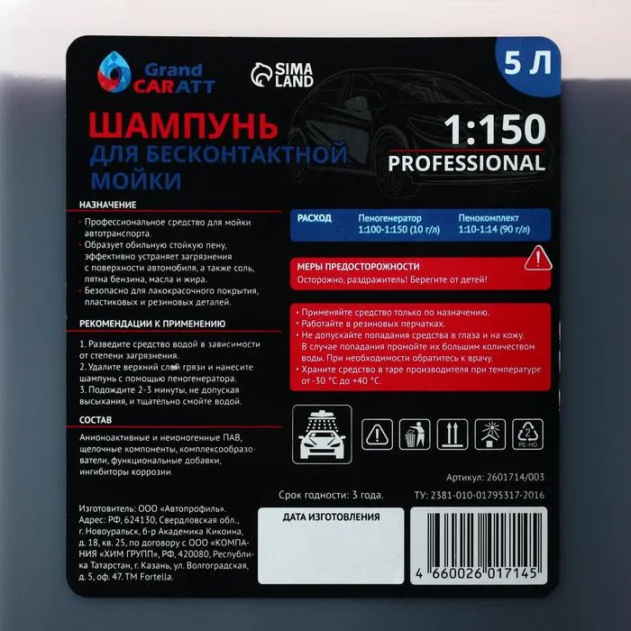 Шампунь для бесконтактной мойки Grand Caratt "Professional", расход 1:120 - 1:150, 5 л 003 — Характеристики
