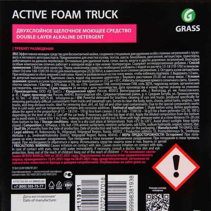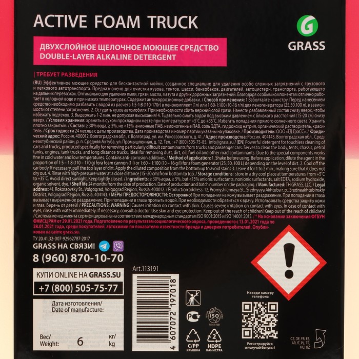 Шампунь для бесконтактной мойки Grass Active Foam Truck, 6 л (1:30-1:70) — Характеристики