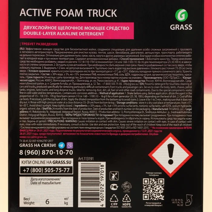 Шампунь для бесконтактной мойки Grass Active Foam Truck, 6 кг предназначен для бесконтактной мойки легкового и грузового автотранспорта, контейнеров ж/д вагонов, двигателей, автоцистерн. Оптимально для удаления тяжелых загрязнений.