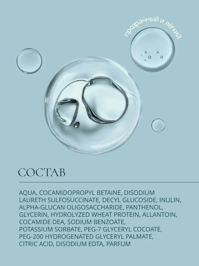 Состав: Aqua, cocamidopropyl betaine, disodium laureth sulfosuccinate, decyl glucoside, inulin, alpha-glucan oligosaccharide, panthenol, glycerin, hydrolyzed wheat protein, allantoin, cocamide dea, sodium benzoate, potassium sorbate, peg-7 glyceryl cocoate, peg-200 hydrogenated glyceryl palmate, citric acid, disodium edta, parfum.