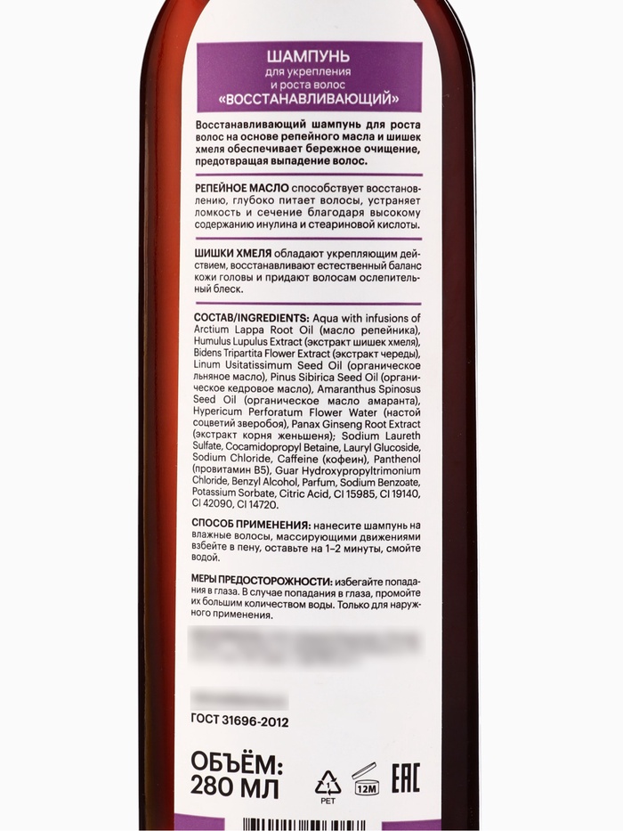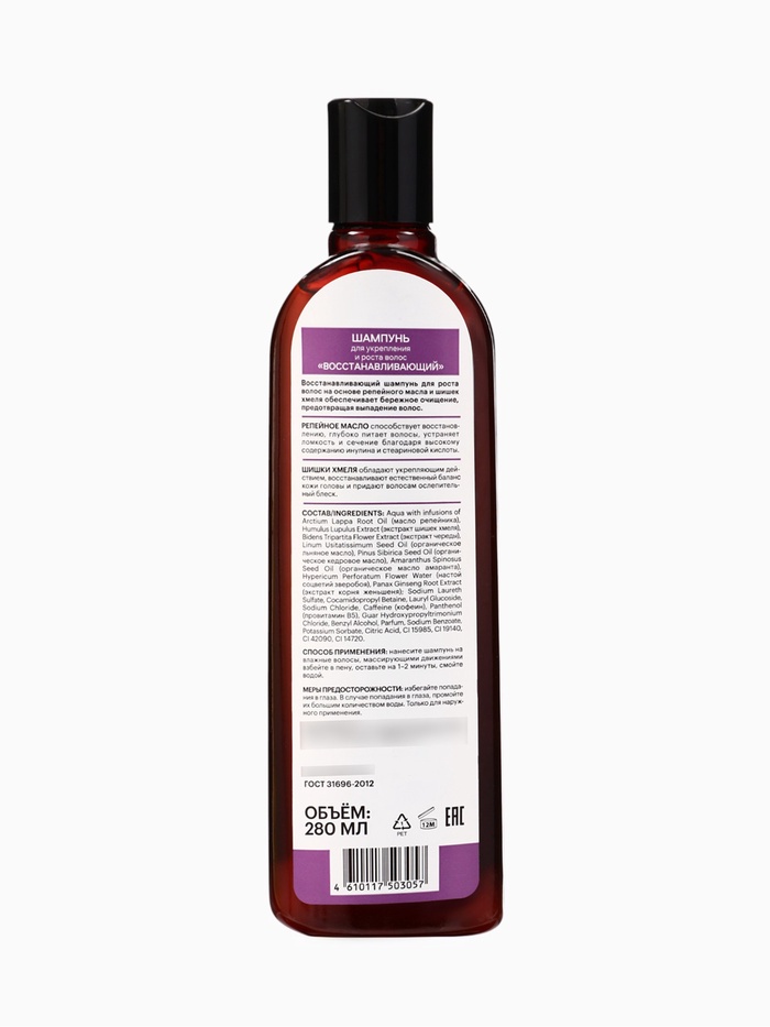 В основе шампуня — натуральные экстракты репейника и сибирских трав, известных своими восстанавливающими и укрепляющими свойствами. Они активно питают волосяные луковицы, улучшают микроциркуляцию кожи головы и способствуют росту густых и сильных волос.