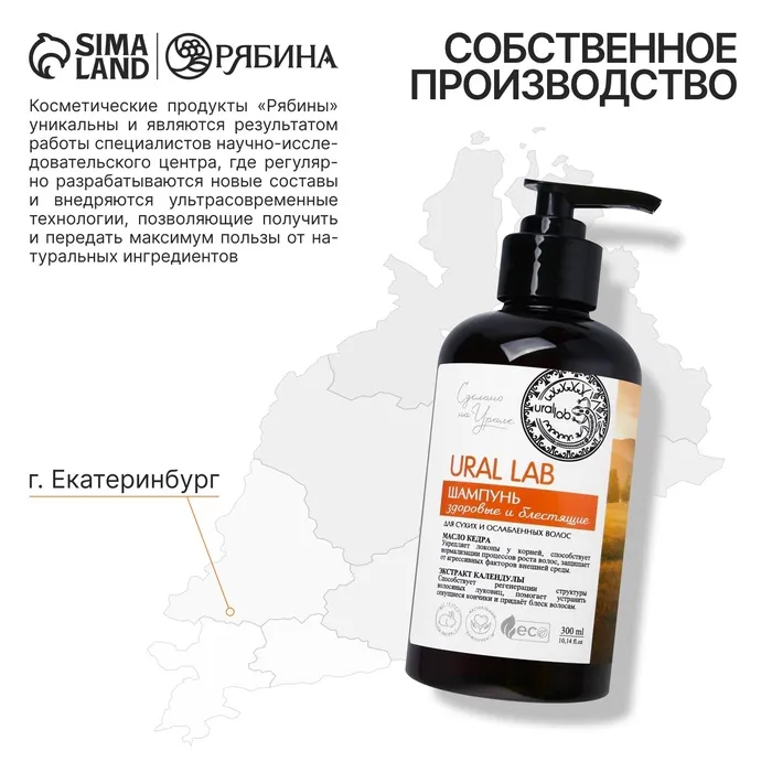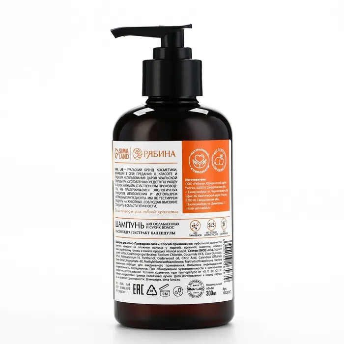 Шампунь для сухих и ослабленных волос с маслом кедра и экстрактом календулы, здоровые и блестящие, 300 мл, ECO LAB by URAL LAB — Характеристики