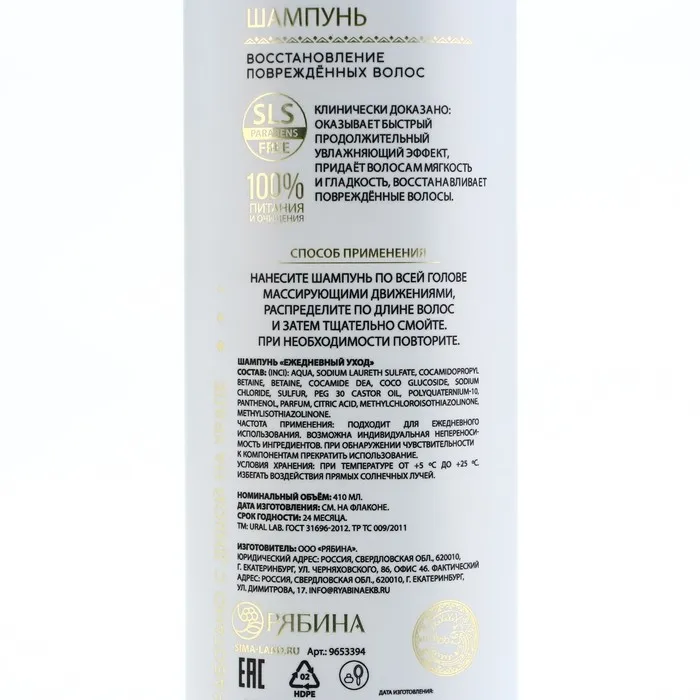 Шампунь для волос, 410 мл, восстановление повреждённых волос, BASIC LINE by URAL LAB — Характеристики