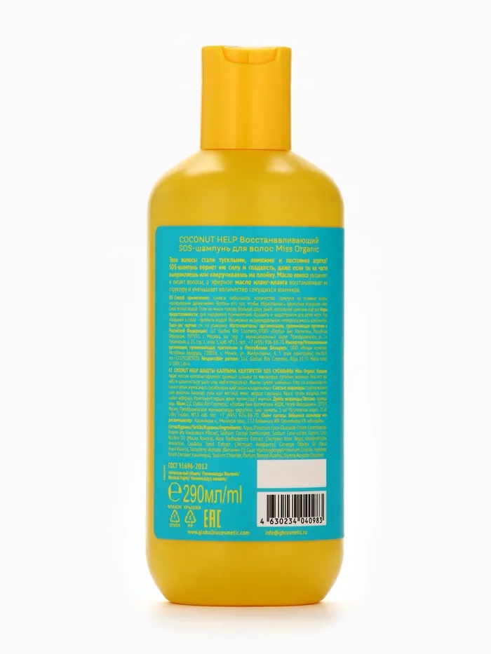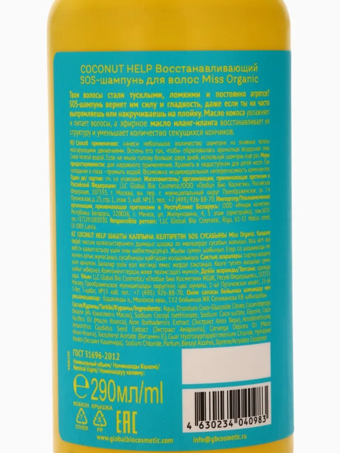 Состав: Aqua, Disodium Coco-Glucoside Citrate, Cocamidopropyl Betaine (Из Кокосового Масла), Sodium Cocoyl Isethionate, Sodium Сoco-sulfate, Glycerin, Cocos Nucifera Oil (Масло Кокоса), Aloe Barbadensis Extract (Экстракт Алоэ Вера), Amodimethicone, Amaranthus Caudatus Seed Extract (Экстракт Амаранта), Cananga Odorata Oil (Масло Иланг-Иланг), Tocopheryl Acetate (Витамин Е), Guar Hydroxypropyltrimonium Chloride, Hydrolyzed Keratin, Sodium Chloride, Parfum, Benzyl Alcohol, Styrene/Acrylates Copolymer.