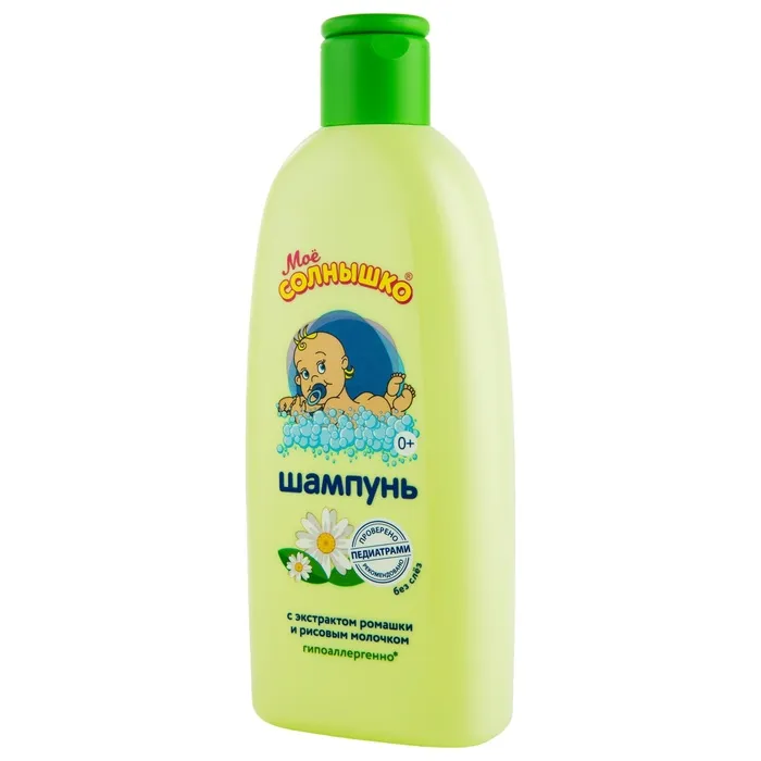 Экстракт ромашки и рисовое молочко мягко ухаживают за кожей головы новорожденного, не сушат её.