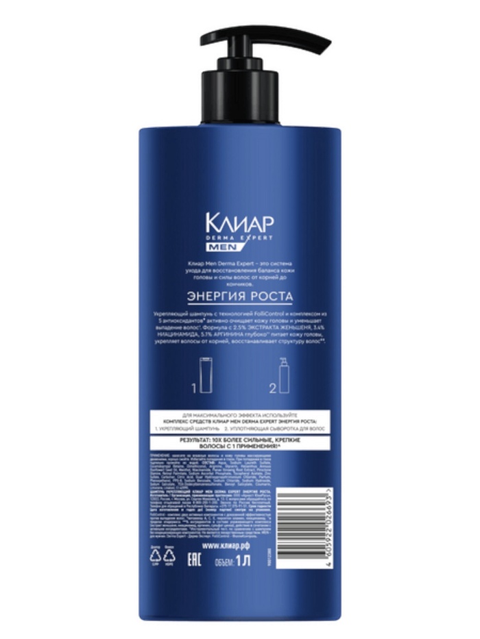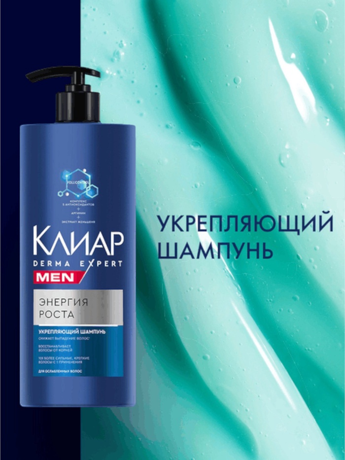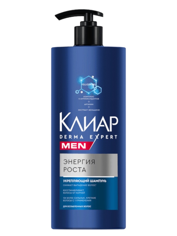 Клиар Men Derma Expert Энергия роста — мужской шампунь укрепляющий от выпадения волос с комплексом из 5 антиоксидантов, аргинином и экстрактом женьшеня.