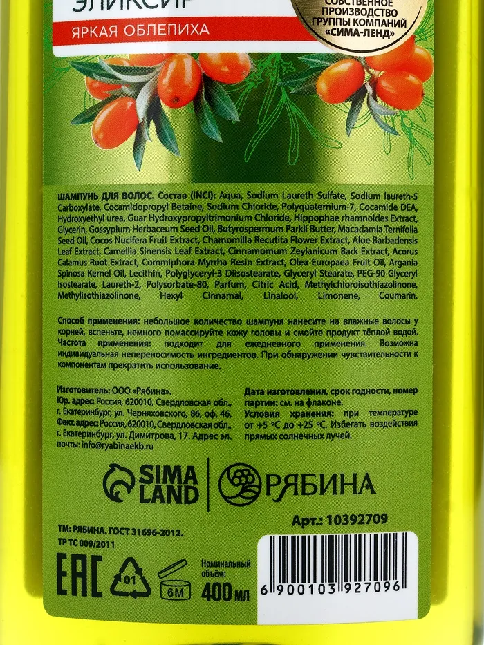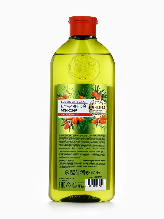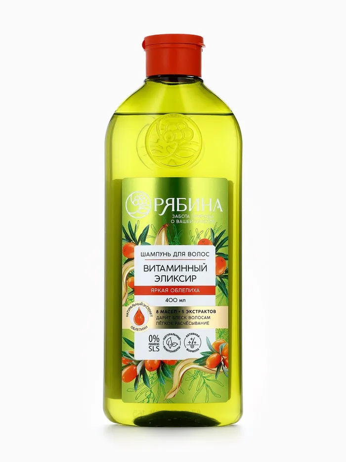 Шампунь для волос, витаминный эликсир, аромат облепихи, 400 мл, Рябина — Характеристики