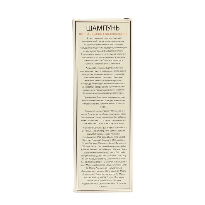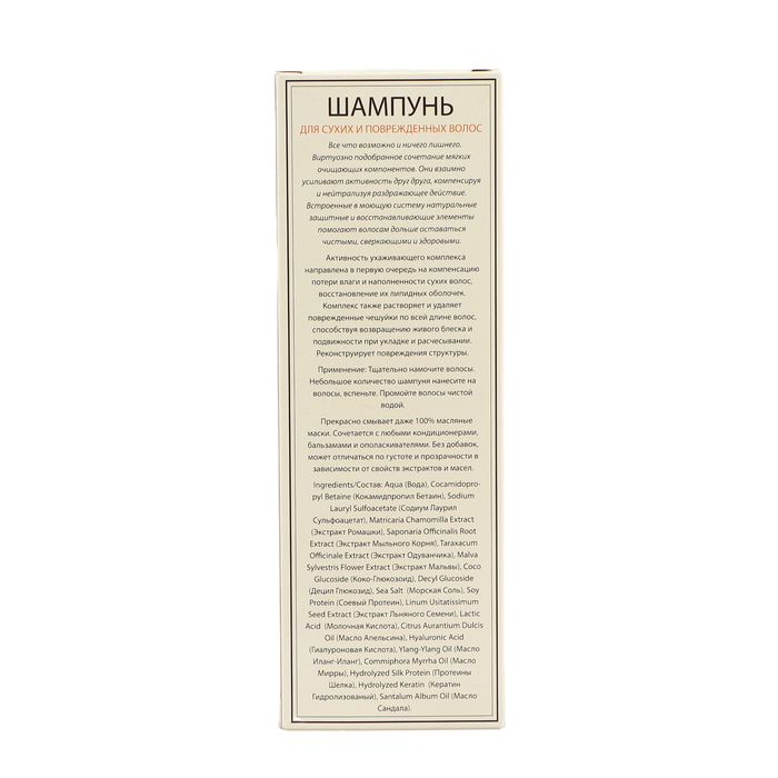 Состав: Вода; гиалуроновая кислота; молочная кислота; децил глюкозид; ромашки экстракт; кокамидопропил бетаин; коко-глюкозид; протеин шелка; мальвы экстракт; гидролизированный кератин; соль морская; льна экстракт; мыльного корня экстракт; содиум лаурил сульфоацетат; иланга-иланга масло; соевый протеин; одуванчика лекарственного экстракт; мирры масло; апельсина масло; сандалового дерева масло
