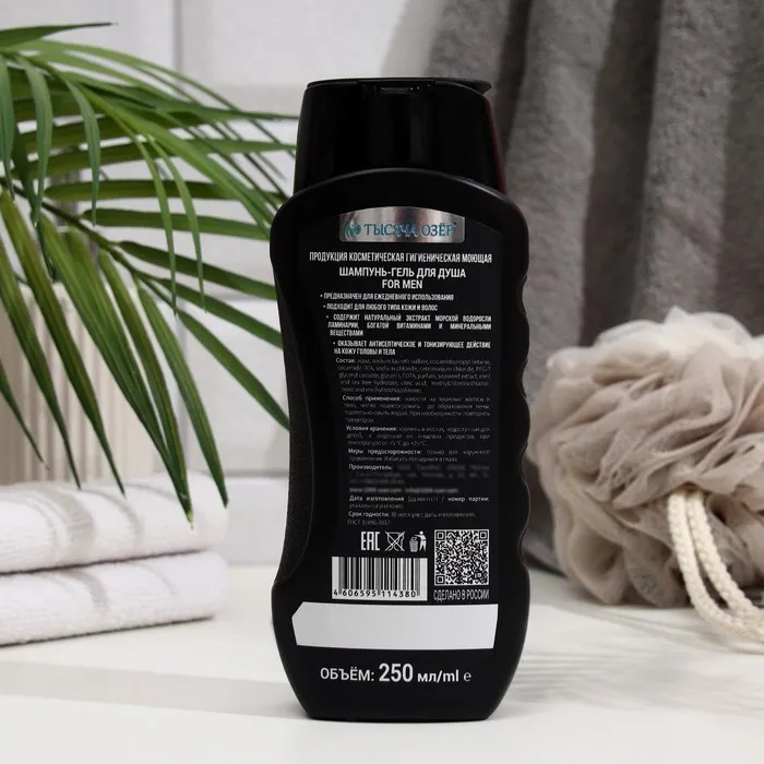 Добавьте в свой уход мужской шампунь-гель для душа ТЫСЯЧА ОЗЁР "FOR MEN" с экстрактом водорослей. Он идеально подходит для мужчин, которые хотят, чтобы ежедневная рутина была быстрой, простой и эффективной. Универсальный шампунь-гель ALL in ONE бережно очищает кожу, не лишая ее необходимой влаги. Ароматная пена отлично освежает волосы и кожу головы, избавляя от избытка кожного сала, грязи и пота. Это бодрящее средство включает в себя мощные увлажняющие компоненты и натуральные экстракты морских водорослей, которые содержат более 65 полезных витаминов и минералов, обладают противовоспалительным действием, способствуют тонизированию кожи, укреплению и росту волос, делая их гладкими, сильными и здоровыми. Гипоаллергенный состав подойдет для всех типов волос и чувствительной кожи. ТЫСЯЧА ОЗЁР "ALL in ONE" 2в1 – многофункциональный гель для мужчин, на который можно положиться.