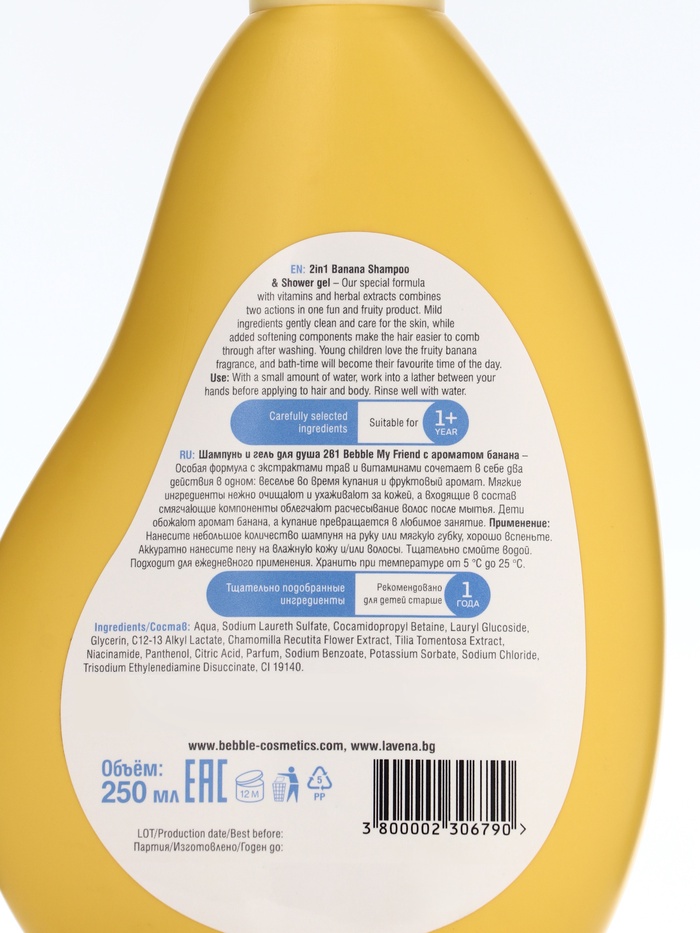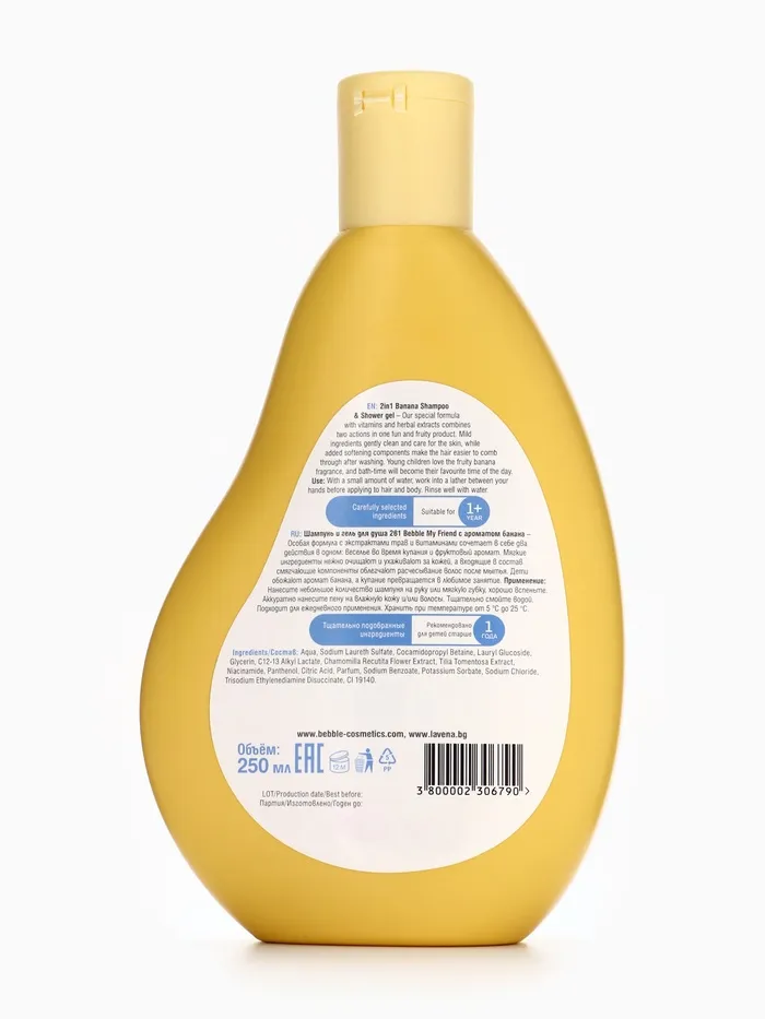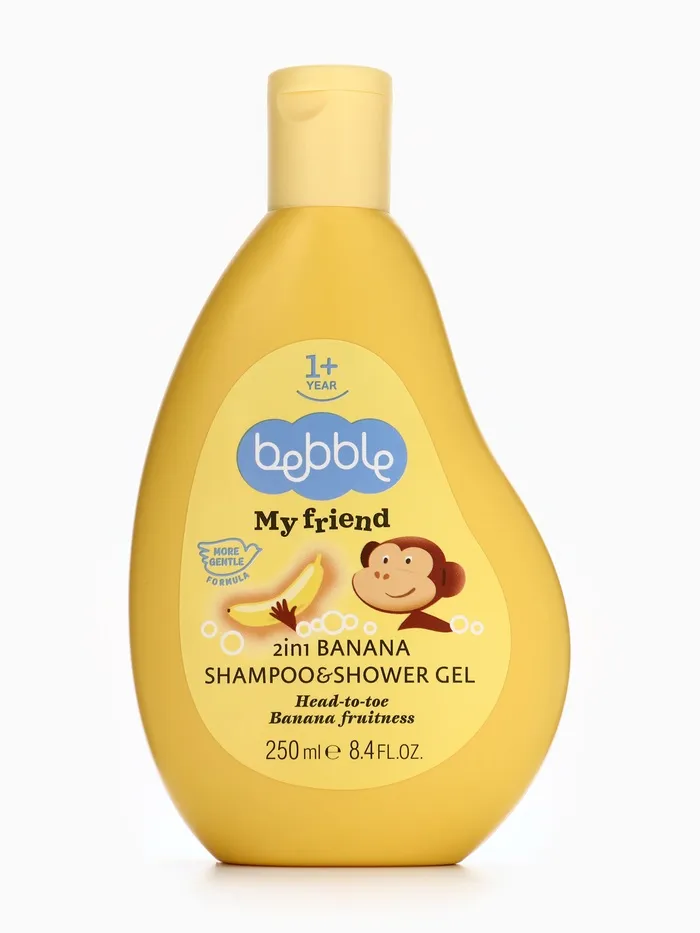 Шампунь и гель для душа 2в1 Bebble My Friend с ароматом банана – Особая формула c экстрактами трав и витаминами сочетает в себе два действия в одном: веселье во время купания и фруктовый аромат.