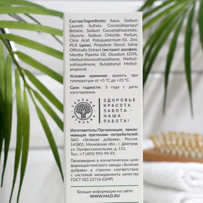 Состав: Aqua, Sodium Laureth Sulfate, Cocamidopropyl Betaine, Sodium Cocoamphoacetate, Glycerin, Sodium Chloride, Parfum, Citric Acid, Polyquaternium-10, Zinc PCA (цинк), Propylene Glycol, Salvia Officinalis Extract (экстракт шалфея), Mentha Piperita Oil, Disodium EDTA, Methylchloroisothiazolinone, Methylisothiazolinone, Butylphenyl Methylpropional