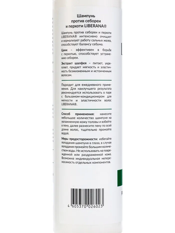 Шампунь против себореи и перхоти LIBERANA интенсивно очищает и нормализует работу сальных желез, способствует балансу себума. Цинк – эффективен в борьбе с перхотью, способствует устранению себореи. Экстракт шалфея – питает, укрепляет, придает мягкость и эластичность безжизненным и истонченным волосам. Подходит для ежедневного применения. Для наилучшего результата рекомендуется использовать в паре бальзамом-кондиционером для мягкости и эластичности волос LIBERANA.