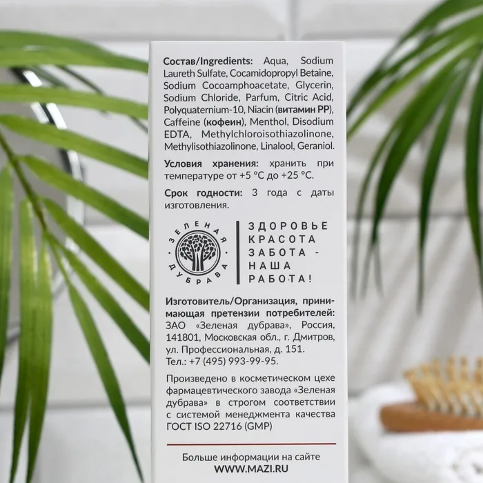 Состав: Aqua, Sodium Laureth Sulfate, Cocamidopropyl Betaine, Sodium Cocoamphoacetate, Glycerin, Sodium Chloride, Parfum, Citric Acid, Polyquaternium-10, Niacin (витамин РР), Caffeine (кофеин), Menthol, Disodium EDTA, Methylchloroisothiazolinone, Methylisothiazolinone, Linalool, Geraniol.
