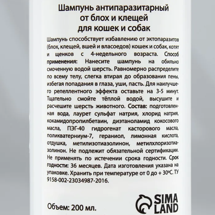 Шампунь "МОЙ ВЫБОР"антипаразитарный от блох и клещей, для кошек и собак, 200 мл — Характеристики