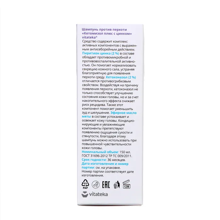 Шампунь от перхоти «Кетомизол + цинк» Vitateka — это эффективное средство для борьбы с перхотью и зудом кожи головы. В состав шампуня входят активные компоненты: кетоконазол (2%) и цинк пиритион (2%), которые обладают противогрибковым и антибактериальным действием. Эти вещества помогают устранить причины возникновения перхоти, нормализуют секрецию кожного сала и уменьшают зуд.