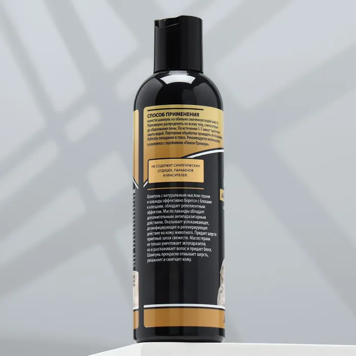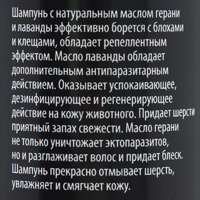 Шампунь с натуральным маслом герани и лаванды эффективно борется с блохами и клещами обладает репеллентным эффектом.
