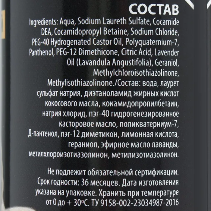 Состав: вода, лаурет сульфат натрия, диэтаноламид жирных кислот кокосового масла, кокамидопропилбетаин, натрия хлорид, пэг-40 гидрогенезированное касторовое масло, поликватерниум-7, Д-пантенол, пэг-12 диметикон, лимонная кислота, гераниол, эфирное масло лаванды, метилхлороизотиазолинон, метилизотиазолинон.