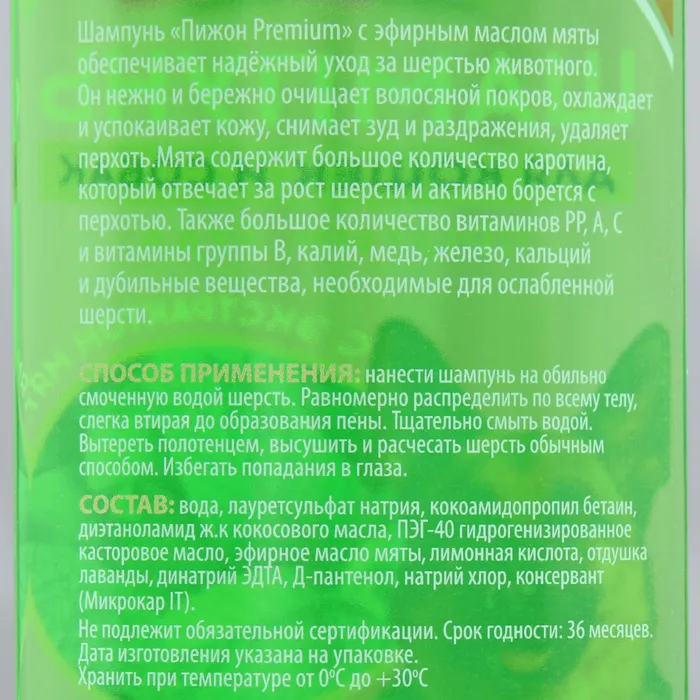 Шампунь для кошек и собак "Пижон Premium" против зуда, с экстрактом мяты, 250 мл.