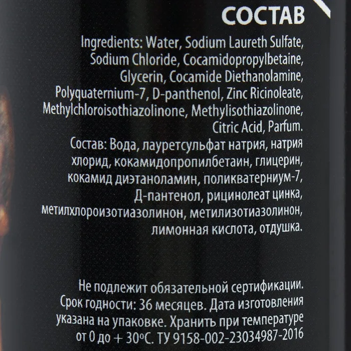 Состав: вода, лаурет сульфат натрия, диэтаноламид жирных кислот кокосового масла, кокамидопропилбетаин, натрия хлорид, поликватерниум-7, Д-пантенол, лимонная кислота, отдушка, рицинолеат цинка, диацетат глутамата тетранатрия, пропандиол, экстракт гамамелиса, метилхлороизотиазолинон, метилизотиазолинон.