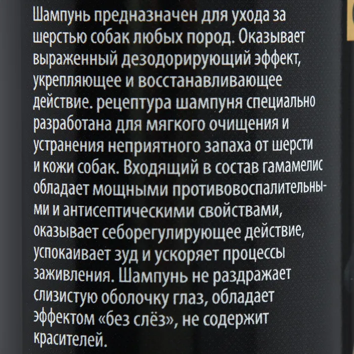 Оказывает выраженный дезодорирующий эффект, укрепляющее и восстанавливающее действие. Рецептура шампуня специально разработана для мягкого очищения и устранения неприятного запаха от шерсти и кожи собак.