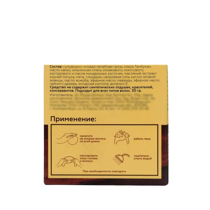 Состав: сульфидно-иловая лечебная грязь озера Тамбукан, масло какао, омыленная смесь оливкового, кокосового, касторового и масла миндальных косточек, масляный экстракт корней лопуха, мята, глицерин, натриевая соль кислот еловой живицы, масло жожоба, эфирное масло лаванды, эфирное масло чайного дерева, янтарная кислота, витамин Е.