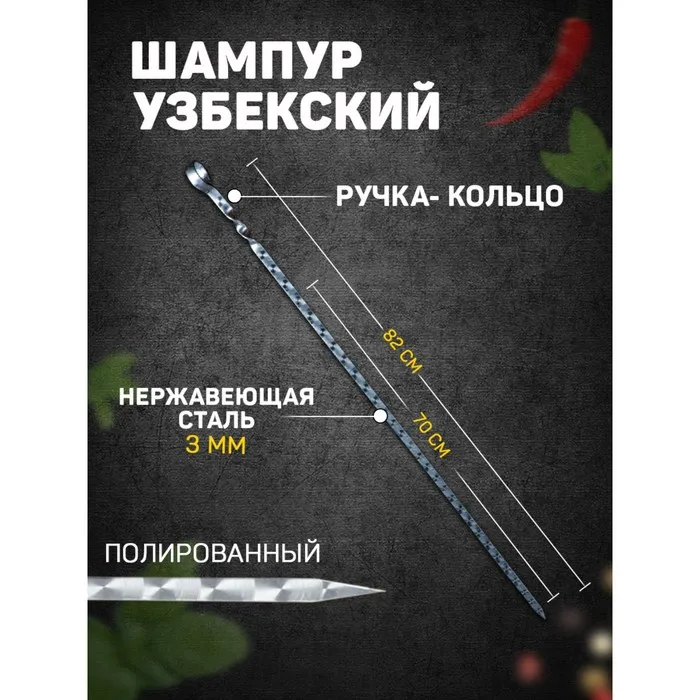 Шампур с ручкой-кольцом, рабочая длина - 70 см, ширина - 10 мм, толщина - 3 мм, с узором — Характеристики