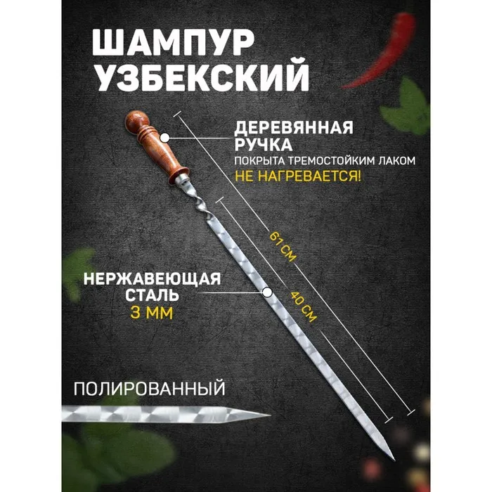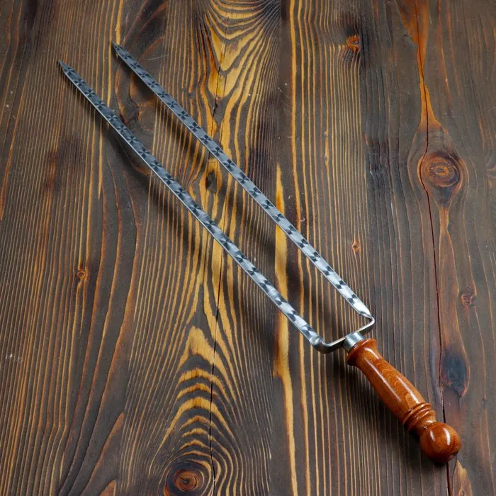 Шампур изготовлен из высококачественной нержавеющей стали, размер и толщина которой обеспечивает равномерную прожарку и сохранение сочности мяса. Резная деревянная рукоять не только придает шарм внешнему виду шампура, но и обеспечивает удобный захват и предотвращает ожоги.