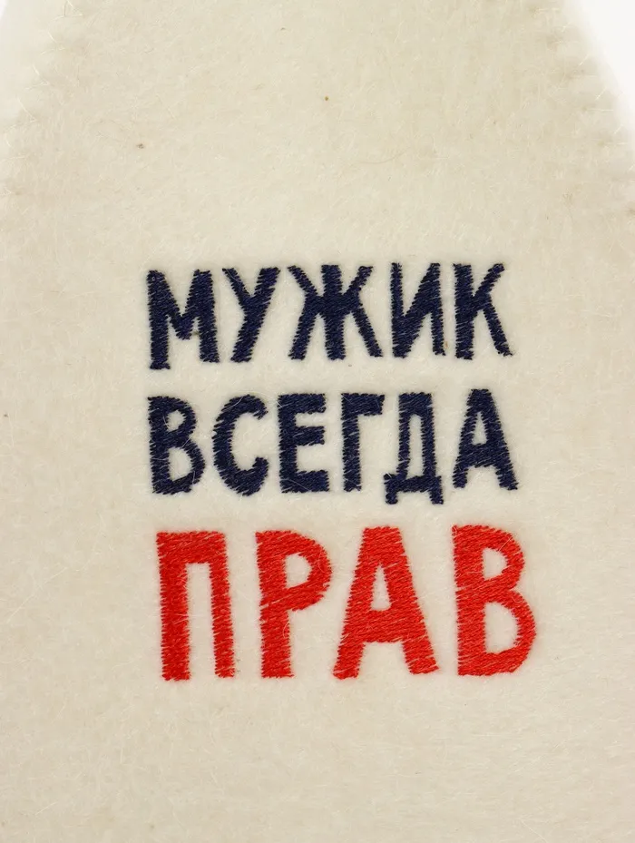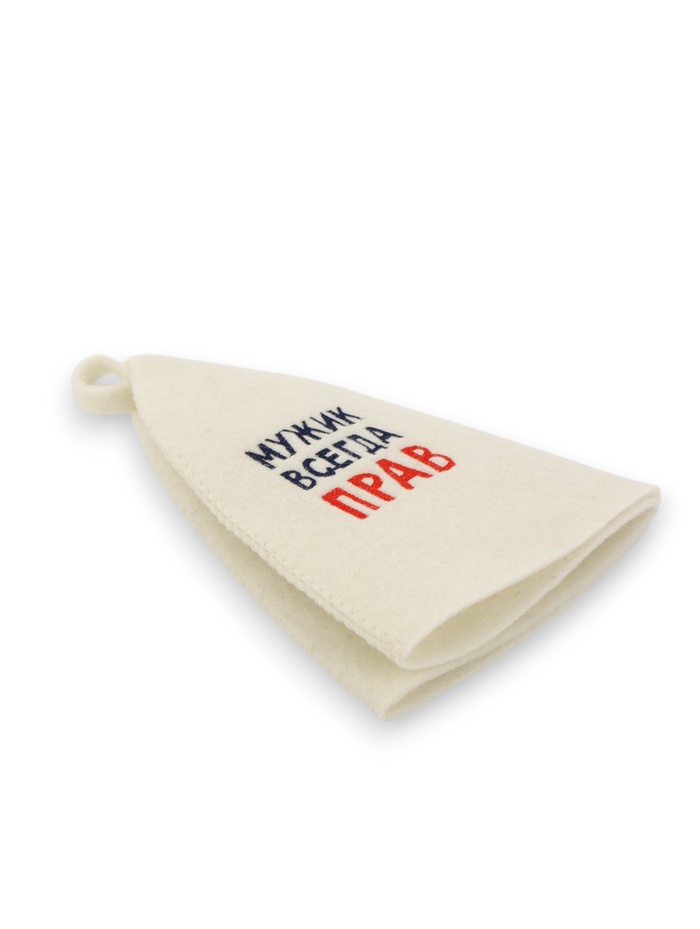 Банная шапка с вышитой фразой из шерсти и полиэфира — мужской аксессуар, который сочетает практическую защиту от перегрева с чувством юмора. Модель для тех, кто ценит ироничное самовыражение.