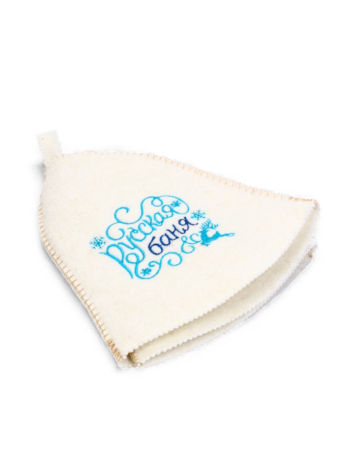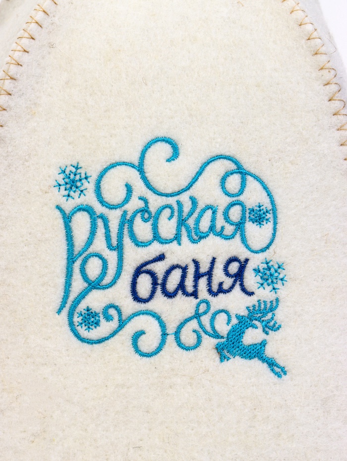 - Светлая основа с вышитым узором: тематический орнамент выполнен стойкими нитями, которые не деформируются от пара и сохраняют цветовой контраст. Рисунок остаётся чётким после многих посещений сауны.