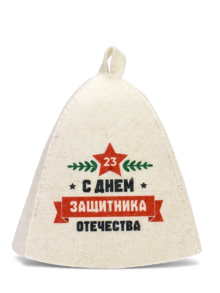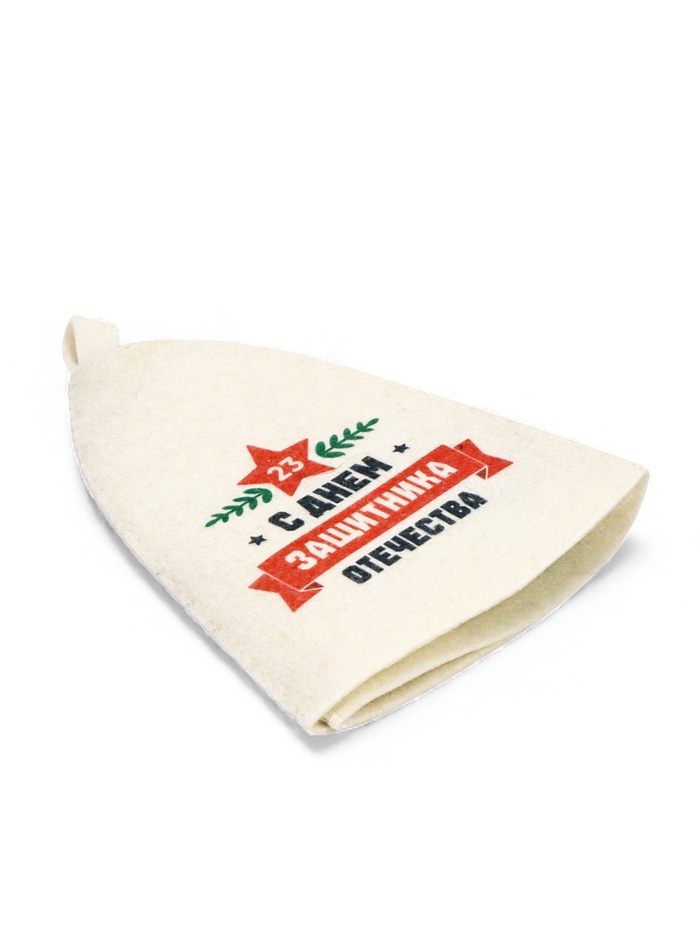 Банная шапка «С Днём защитника Отечества» из шерсти и полиэфира — тематический аксессуар для парной. Она создаёт барьер от перегрева, увеличивая время комфортного пребывания в жаркой атмосфере бани или сауны.