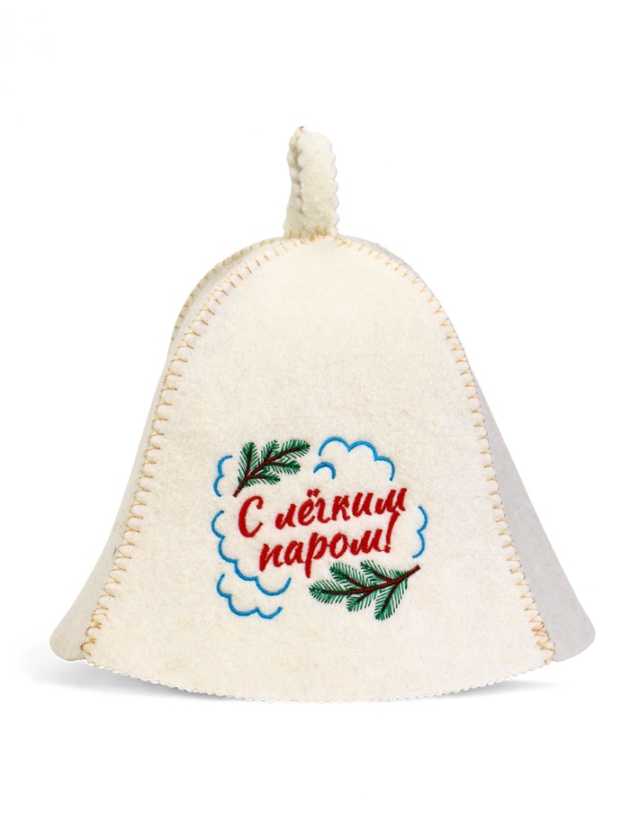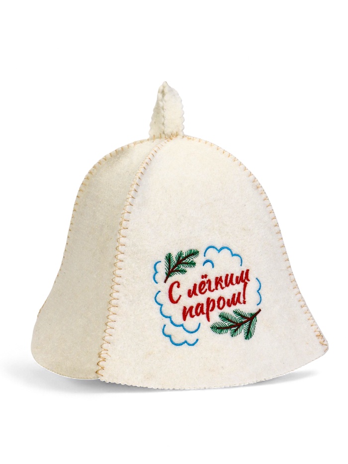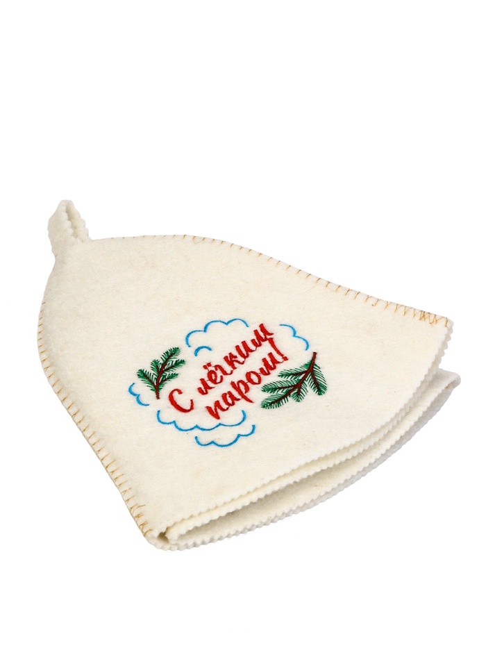 Банная шапка «С лёгким паром!» белая с вышивкой — универсальный аксессуар для комфортного парения. Классический дизайн сочетается с современными материалами, которые обеспечивают защиту и долговечность.