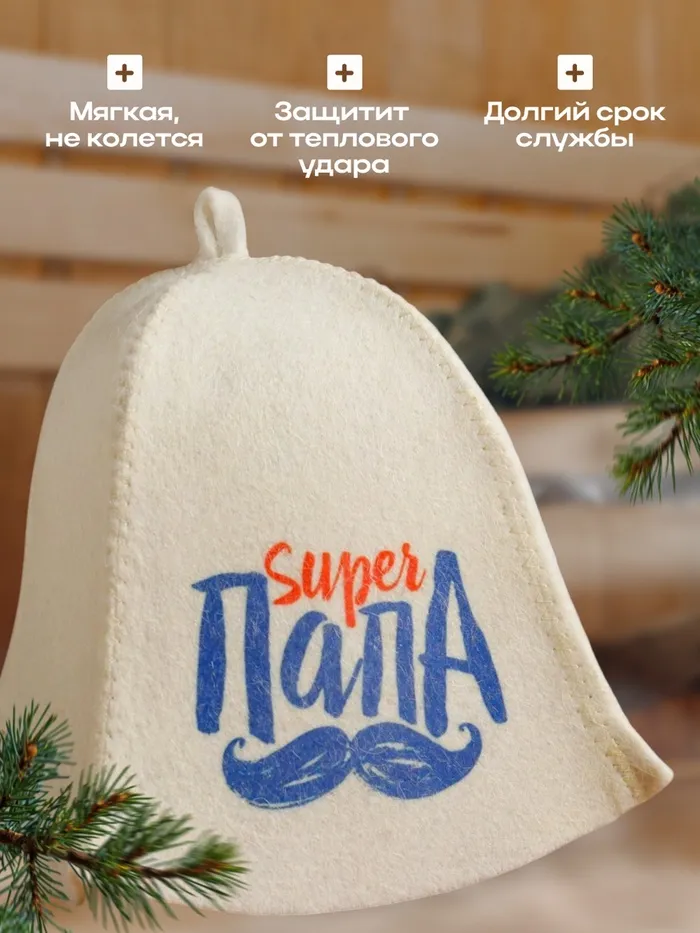 Шапка для бани и сауны, с принтом «Super Папа», полиэфир 20%, шерсть 80%, белая, «Добропаровъ» — Характеристики