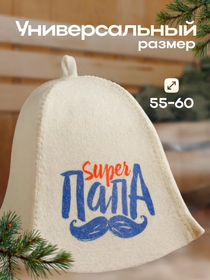 Шапка для бани и сауны, с принтом «Super Папа», полиэфир 20%, шерсть 80%, белая, «Добропаровъ»